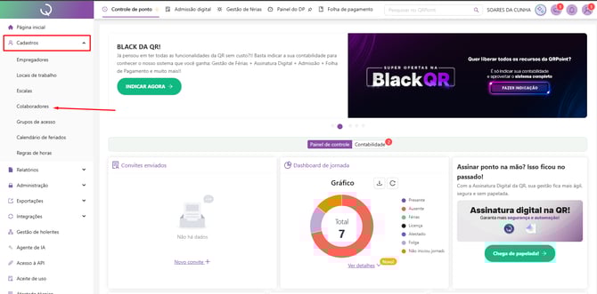 Para adicionar as férias do colaborador acesse a opção do MENU > CADASTRO > COLABORADOR, como mostra a imagem abaixo.