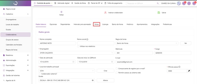 Selecione o colaborador que deseja inserir as férias, e ele será carregado na tela. Em seguida clique na aba FÉRIAS como mostra a imagem abaixo.