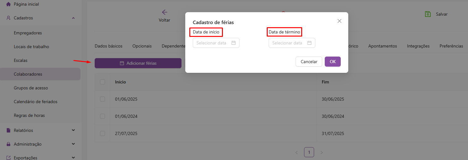 Acessando essa aba o gestor poderá adicionar a data de início e o término das férias de cada colaborador.