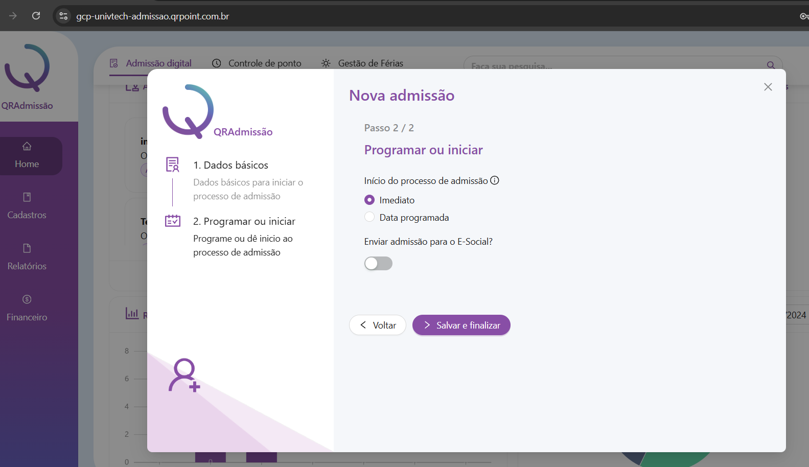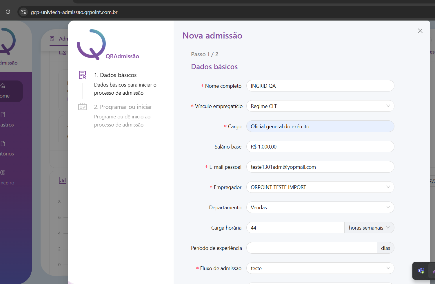 O processo de admissão foi redesenhado para proporcionar uma experiência mais fluida e prática. Agora, ao iniciar uma nova admissão, o usuário será guiado por um modal dividido em etapas: