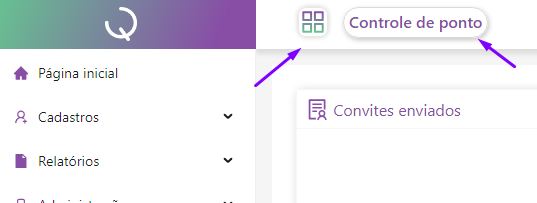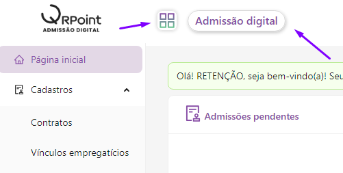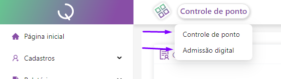 No cabeçalho dos sistemas de controle de ponto e admissão digital, é possível fazer a transição entre as plataformas, clicando em um dos campos marcados pela seta.