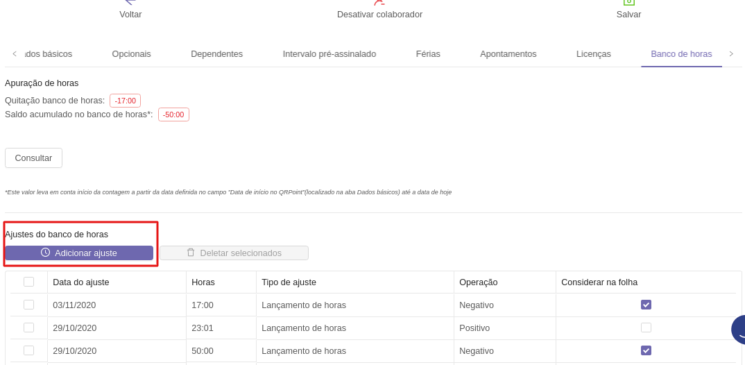 Acessando essa aba o gestor terá acesso ao saldo acumulado do banco de horas assim como poderá realizar ajuste de horas do colaborador como saldo inicial antes de utilizar o QRPoint, ajustes de quitação de horas, entre outros, como mostra a imagem abaixo.
