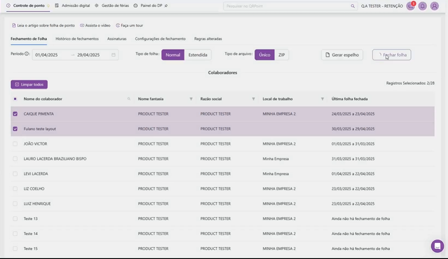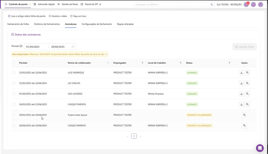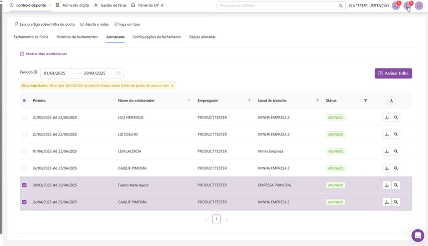 Coluna de seleção para assinar múltiplas folhas de uma só vez;