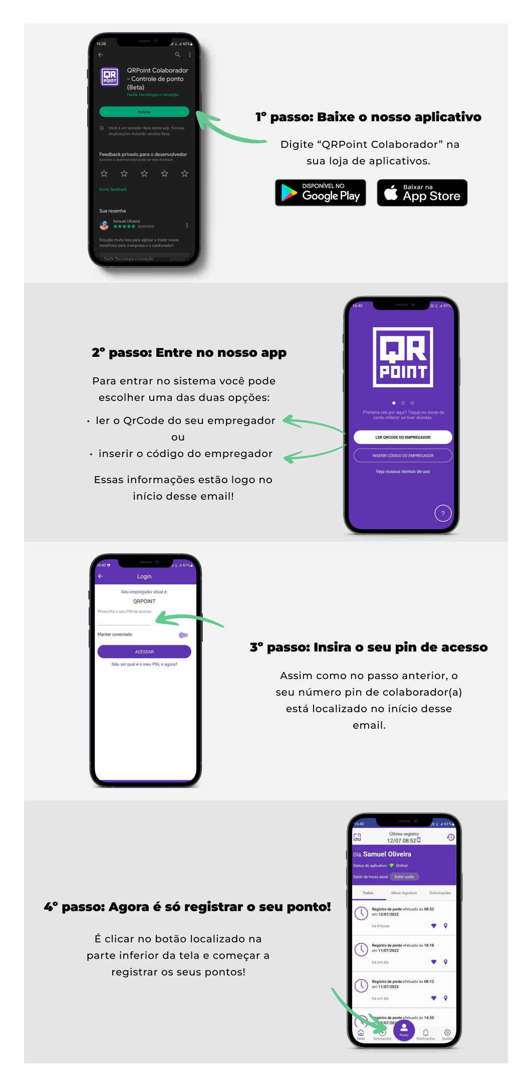 O seu colaborador receberá todas as informações necessárias para iniciar o primeiro acesso no aplicativo QRPoint através do e-mail cadastrado. Essas informações incluirão o Código do Empregador, que poderá ser acessado através de um QRCode para leitura ou por meio de um número para digitação, além do Código PIN, que é uma senha única e intransferível para que o colaborador possa fazer o login no momento do registro de ponto.