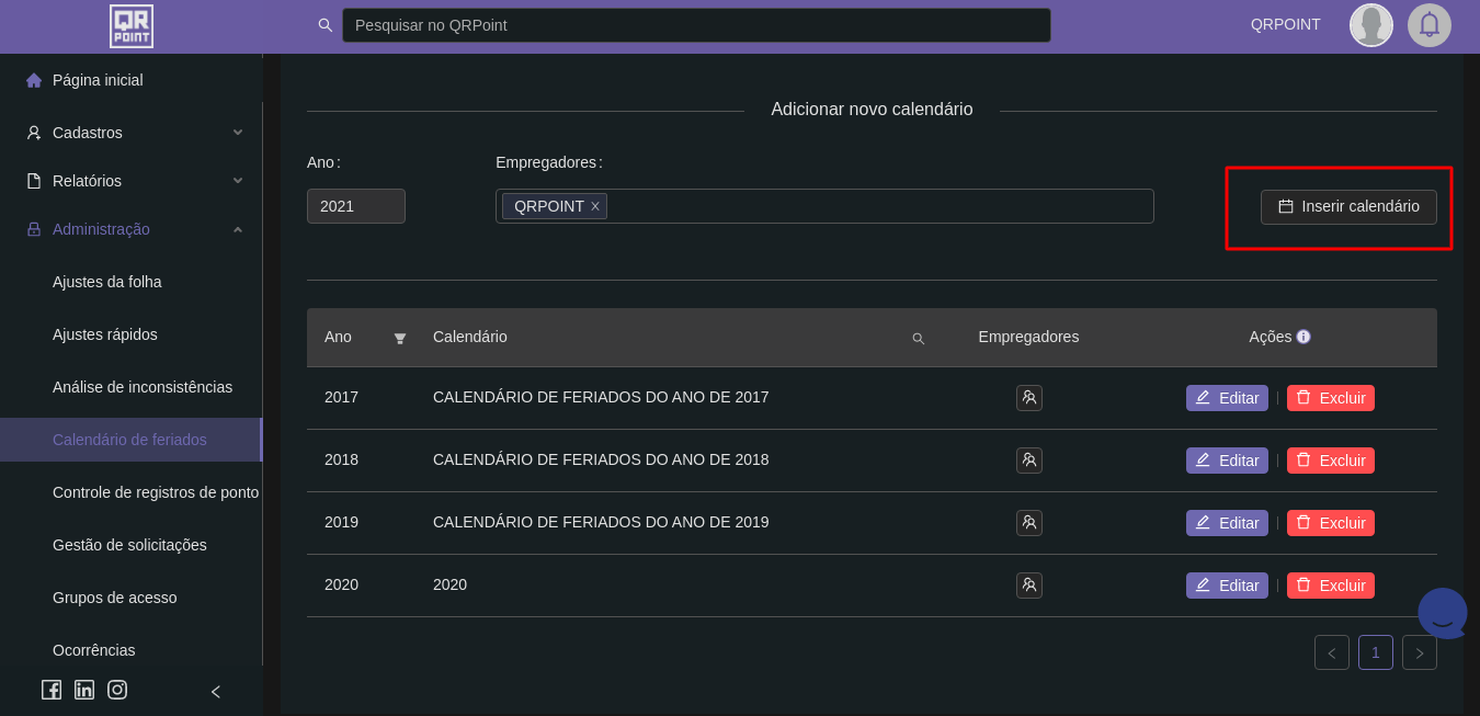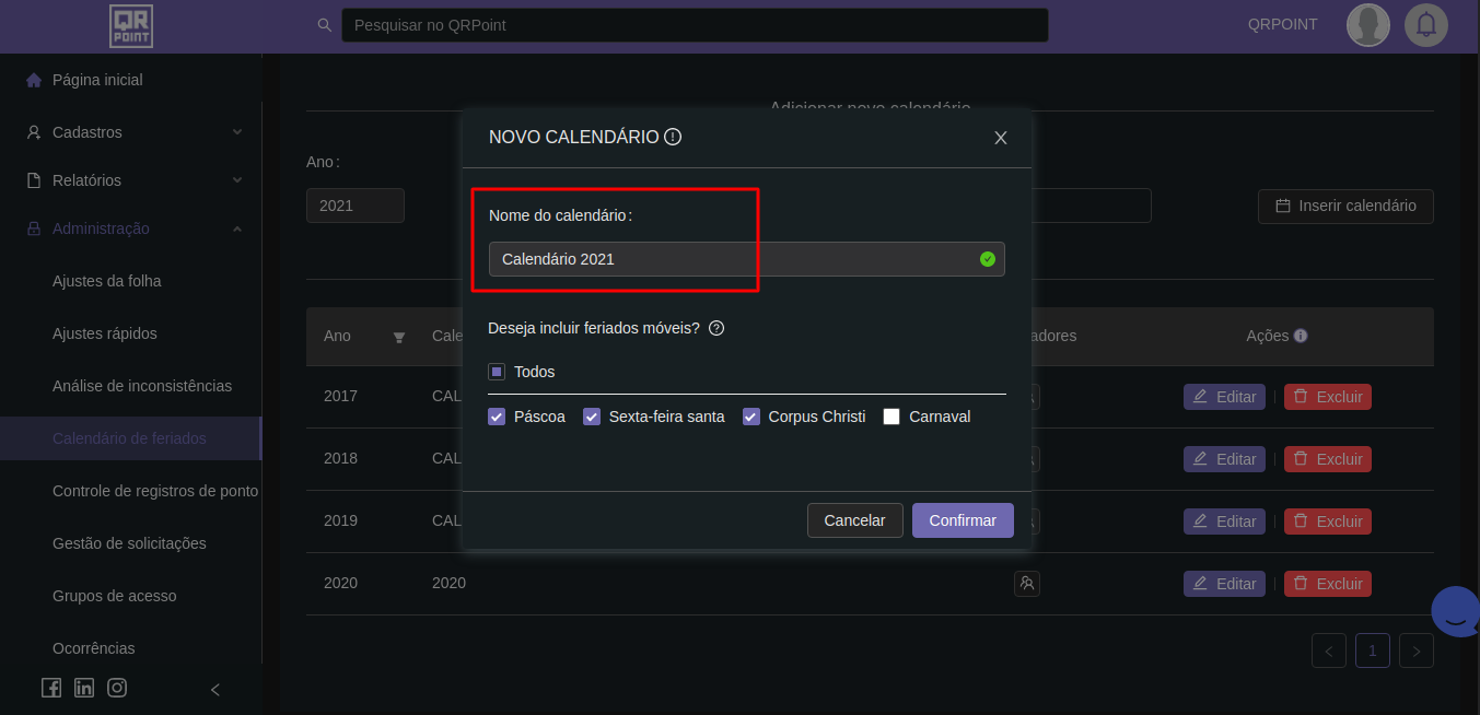 Para aplicar feriados no QRPoint, basta criar um calendário de feriados, onde os feriados de todo o ano serão aplicados automaticamente para os colaboradores. Para criar o calendário, você deve entrar em