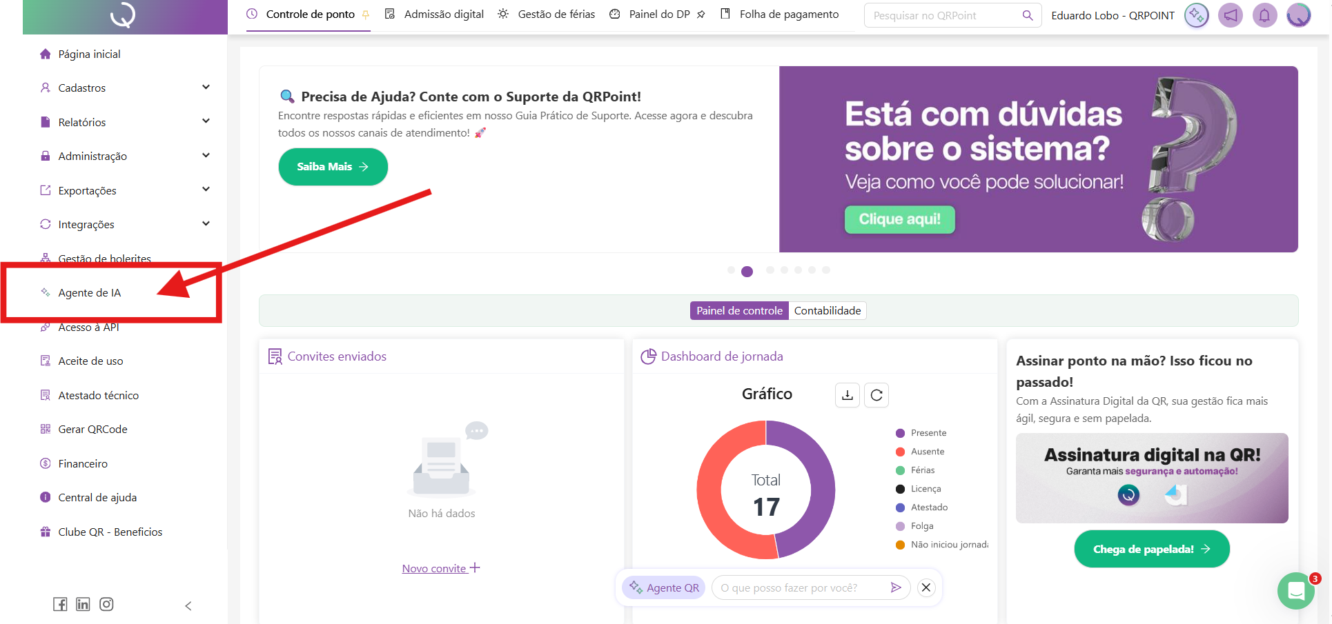 Entre no sistema QRPoint e vá até o menu laterial e clique em Agente de IA. Lá você encontrará a opção de conectar o Agente QR ao WhatsApp.