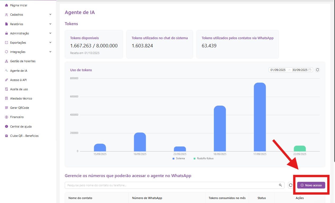 Agora você já pode interagir com o Agente QR diretamente pelo WhatsApp. Ele vai responder dúvidas, realizar ajustes e auxiliar no dia a dia de forma natural, como se fosse mais um contato na agenda da empresa.