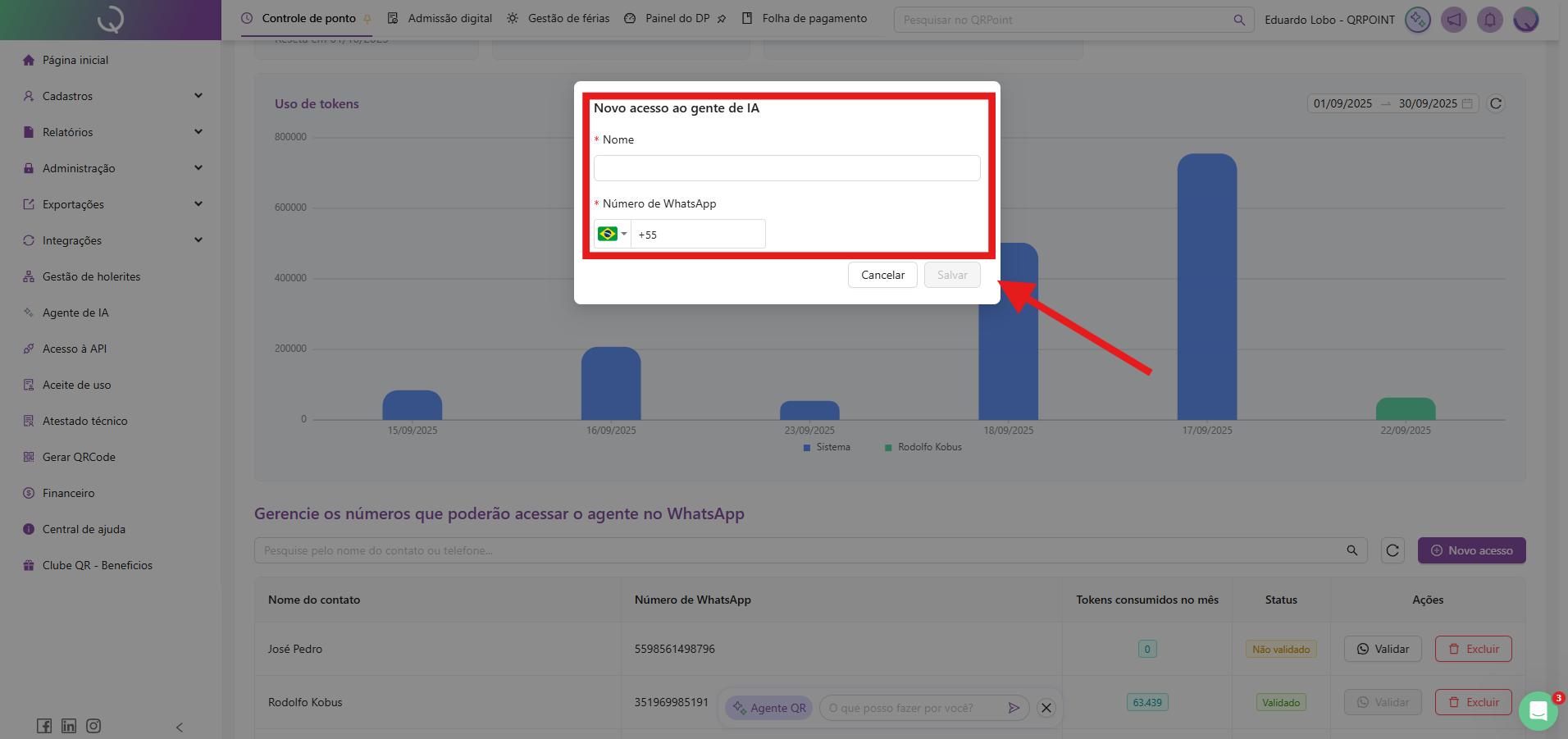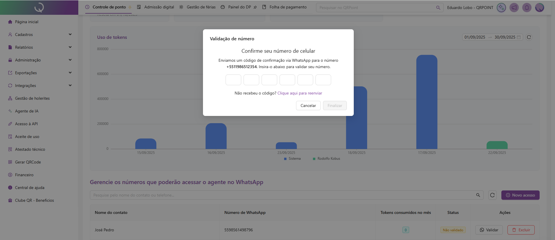 O novo número cadastrado receberá uma mensagem de WhatsApp de nosso Agente QR, solicitando a validação com um código de confirmação. Verifique com o Gestor o número e finalize o cadastro para validar este novo acesso.