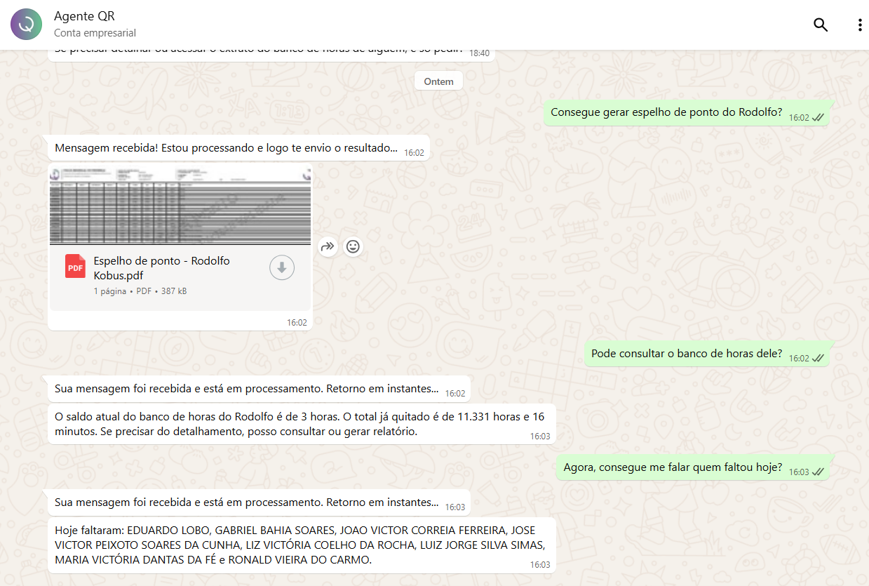O WhatsApp já faz parte do dia a dia das equipes de RH e DP. Por isso, integrar o Agente QR diretamente ao aplicativo é um grande ganho: os gestores conseguem interagir de forma simples, sem precisar abrir sistemas ou trocar de tela.