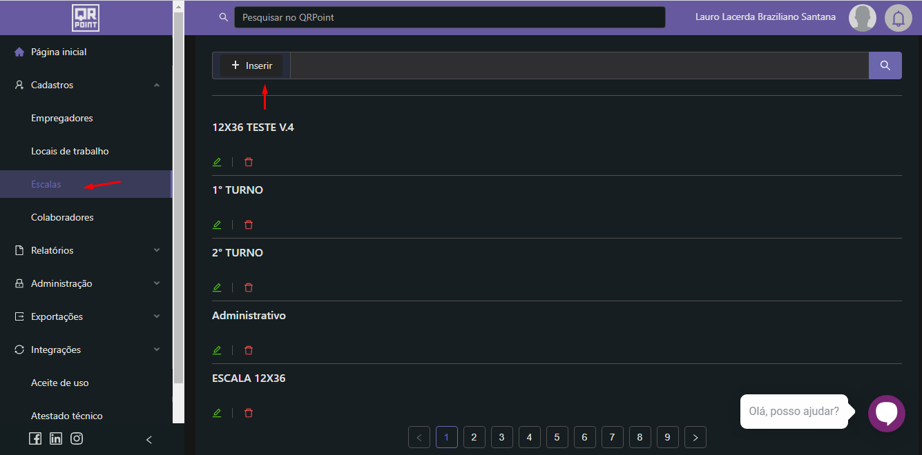 Para cadastrar uma escala 12x36, acesse o menu em CADASTROS > ESCALAS e clique em "Inserir", como mostra a imagem abaixo.