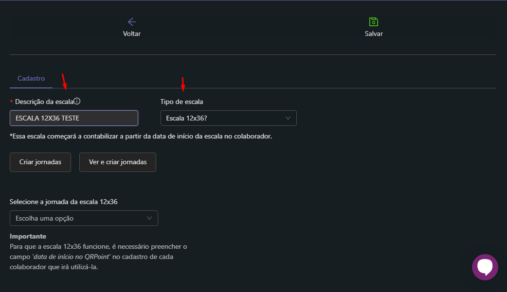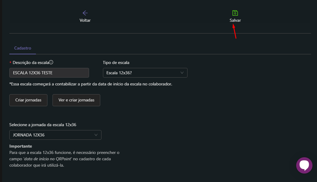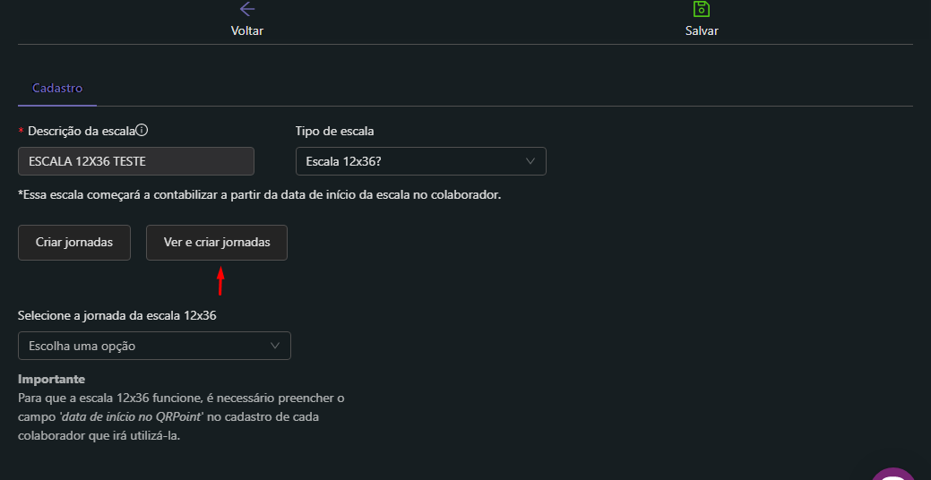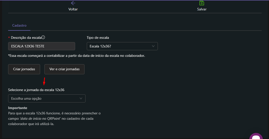 Além disso, é necessário que o campo "Data de início no QRPoint", presente no cadastro do colaborador, esteja preenchido para que a escala 12x36 funcione.