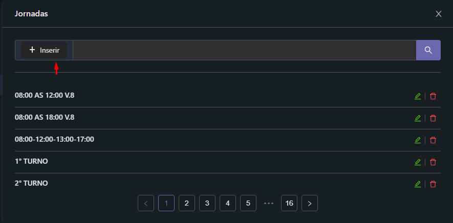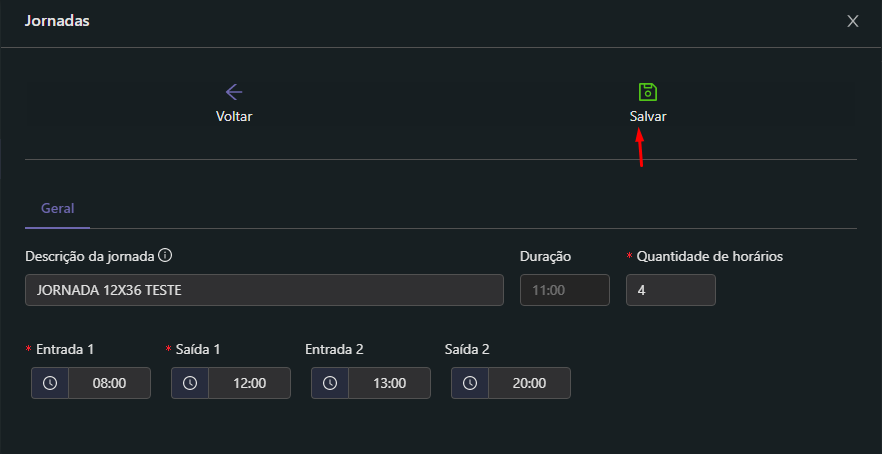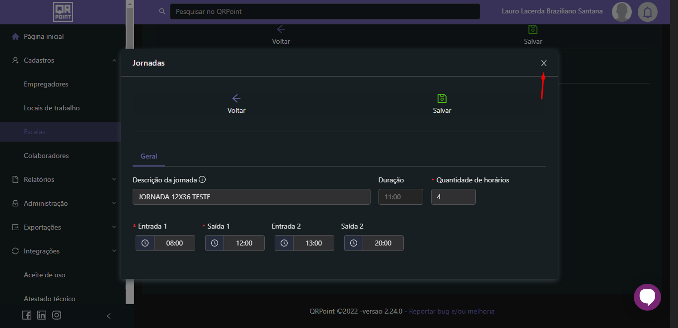 Você criou a jornada de trabalho que compõe a escala dessa pessoa colaboradora. Então, você deve fechar a tela de criação das jornadas, clicando no "x".