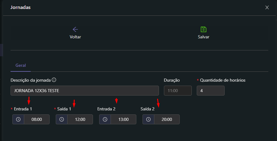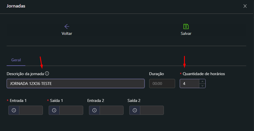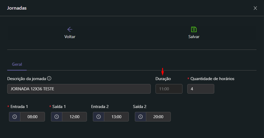 Ao inserir todos os horários, o sistema irá calcular a duração da jornada de trabalho diária da pessoa colaboradora, evidenciada no campo de "Duração".