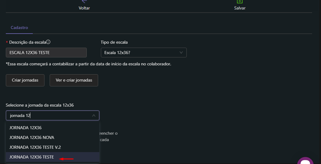 De volta à tela da escala, você irá vincular a jornada à escala, clicando no campo "Selecione a jornada da escala 12x36", como no exemplo abaixo:
