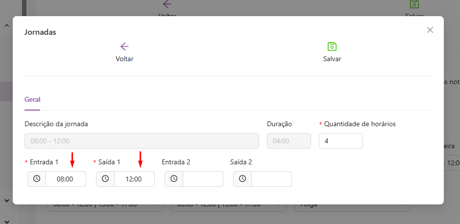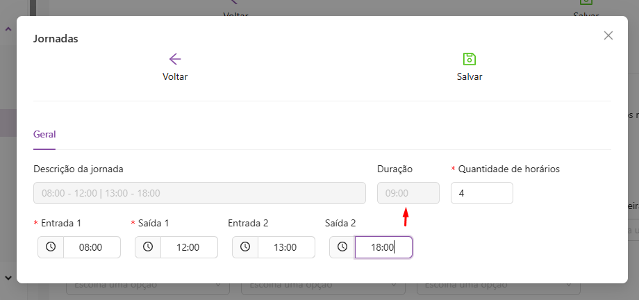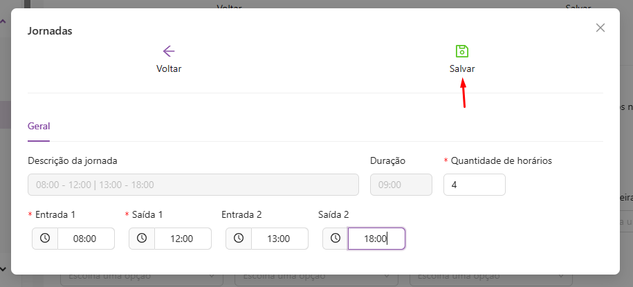 Ao inserir todos os horários, o sistema irá calcular a duração da jornada de trabalho diária da pessoa colaboradora, evidenciada no campo de "Duração".