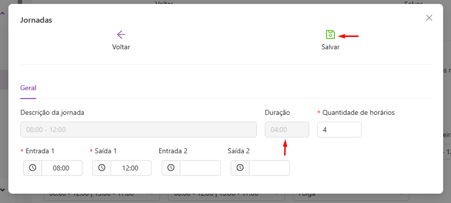 Por fim, você poderá conferir a carga horária dessa jornada no campo "Duração" e clicar em "Salvar" para finalizar o processo.