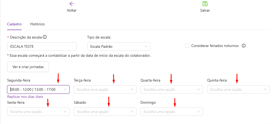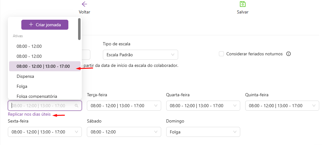 De volta à tela da escala, você irá vincular as jornadas criadas aos dias correspondentes da semana. Selecionando a jornada "08:00 - 12:00 - 13:00 - 18:00" no local da segunda-feira, você pode clicar em "Replicar nos dias úteis" depois, a fim de preencher os outros dias da semana de forma automática.