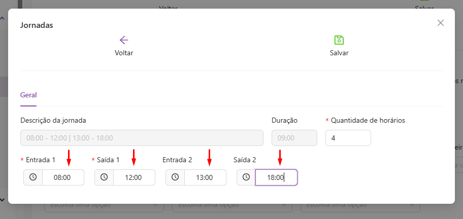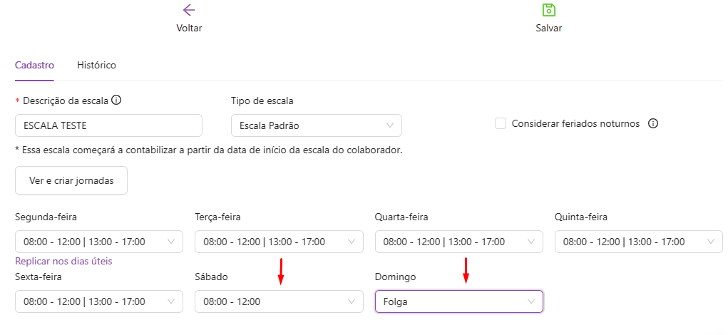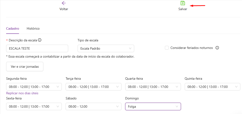 E se a escala for noturna? O processo é exatamente o mesmo. A única diferença é que, ao criar a jornada, você deve inserir os horários correspondentes ao período noturno.