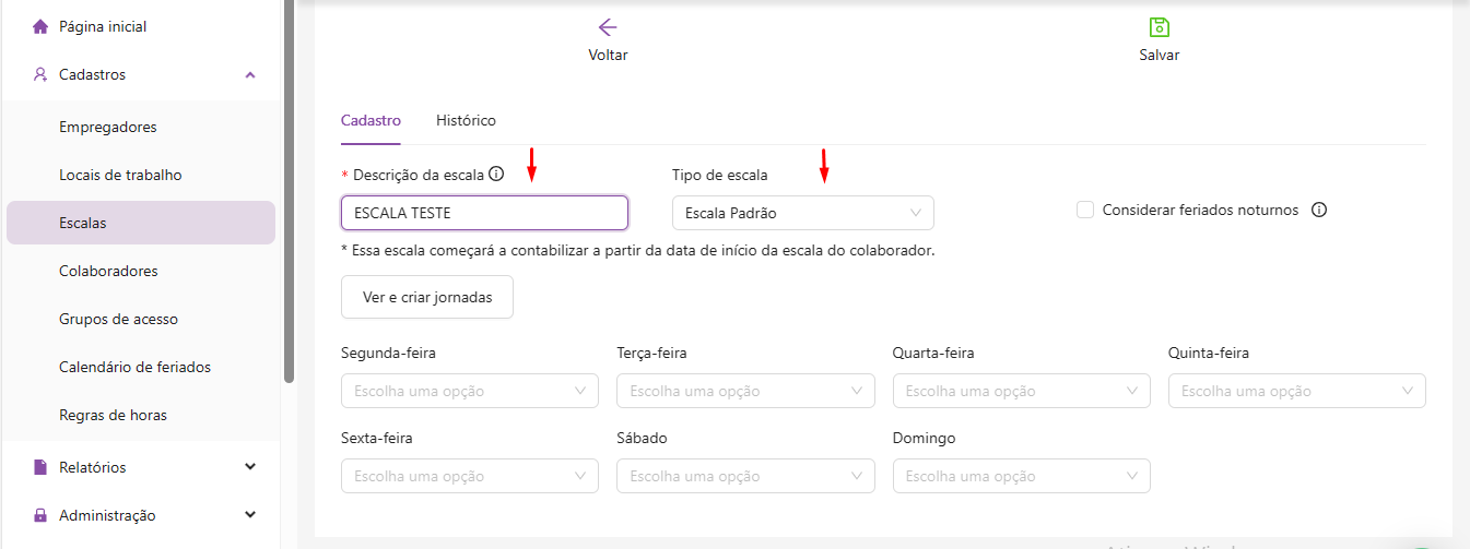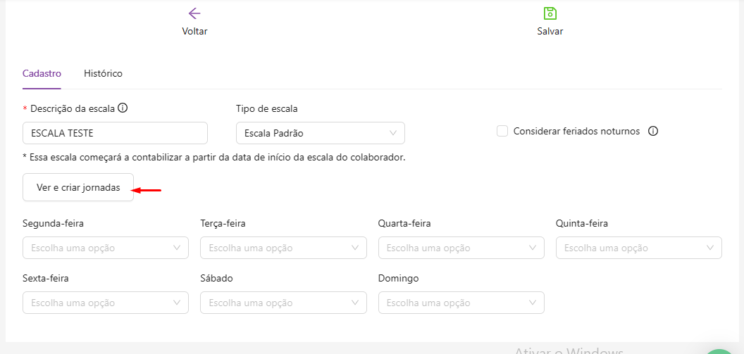 A escala é um conjunto de jornadas. Dessa forma, o próximo passo é cadastrar as jornadas de trabalho da pessoa colaboradora