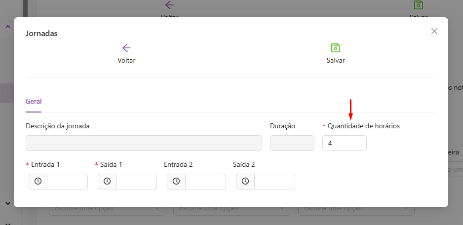 Em seguida, você escolherá a quantidade de pontos que a pessoa colaboradora irá registrar no dia dentro do campo "Quantidade de horários", que vem por padrão preenchido com 4. Para esse exemplo, manteremos os 4 horários.