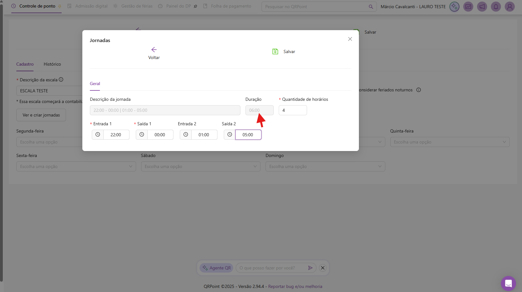 Ao inserir todos os horários, o sistema irá calcular a duração da jornada de trabalho diária da pessoa colaboradora, evidenciada no campo de "Duração".