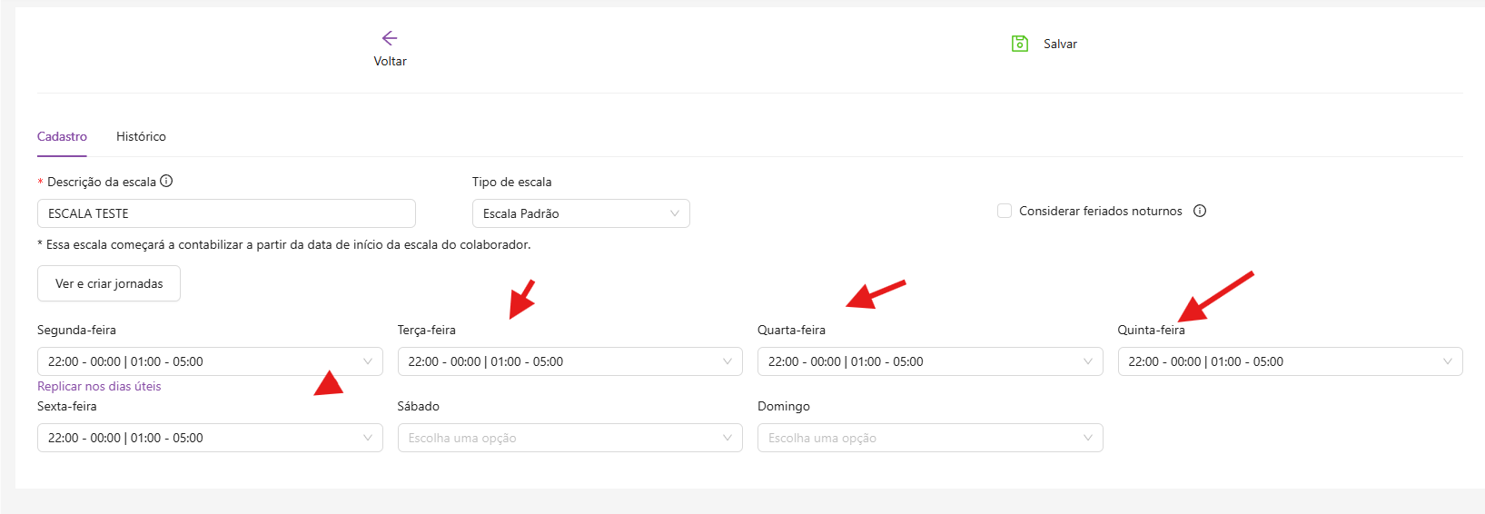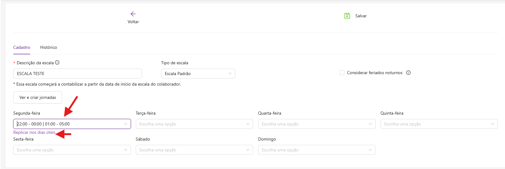 De volta à tela da escala, você irá vincular as jornadas criadas aos dias correspondentes da semana. Selecionando a jornada "22:00 - 00:00 - 01:00 - 05:00" no local da segunda-feira, você pode clicar em "Replicar nos dias úteis" depois, a fim de preencher os outros dias da semana de forma automática.