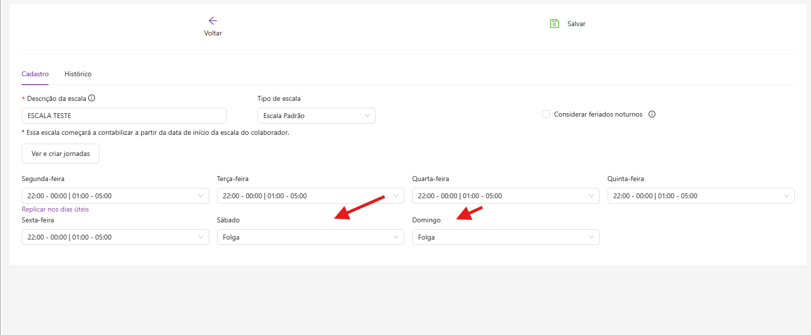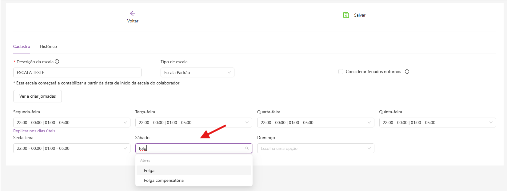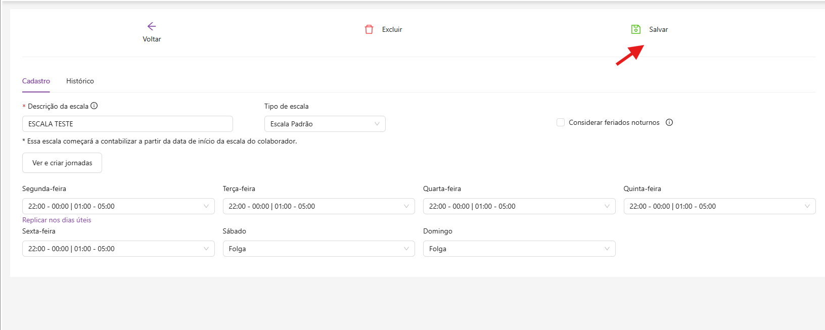 Aprenda a cadastrar uma escala padrão, com jornada noturna.