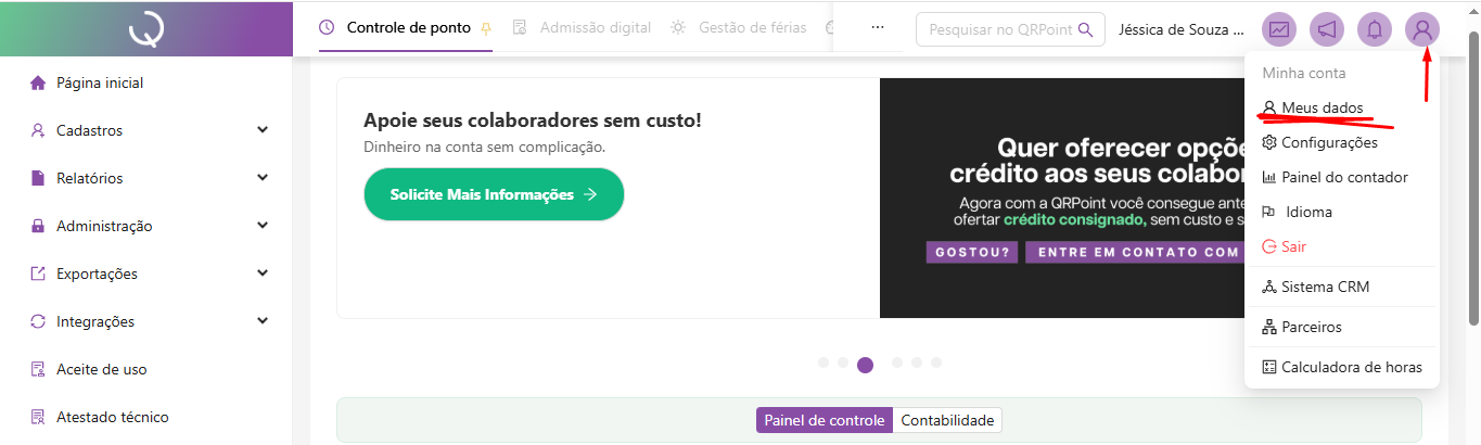 Na pagina inicial do site, acesse o menu flutuante na barra superior da tela em "meus dados":