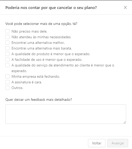 Nesta etapa pedimos que nos conte um pouco sobre o motivo do cancelamento da assinatura, seu feedback é muito importante!