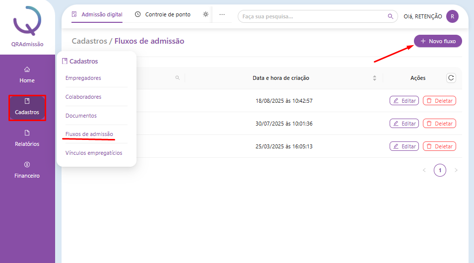 Acessando a tela de cadastros > Fluxo de admissão > Clicando em "novo fluxo"