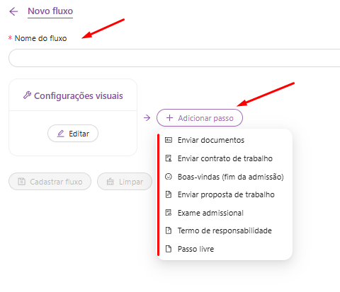 Recurso flexível que permite à empresa criar etapas personalizadas no fluxo de admissão.