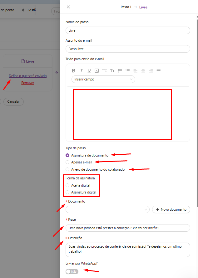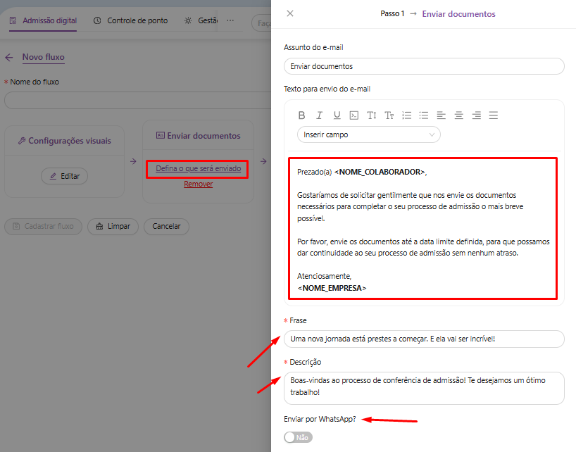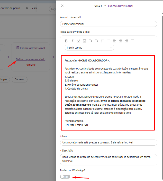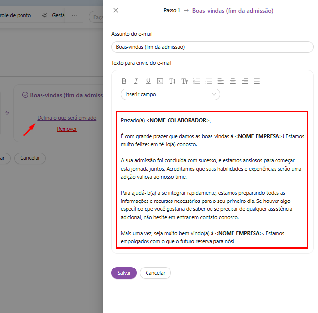 Um passo voltado para a conclusão do processo, permitindo enviar uma mensagem de boas-vindas ao novo colaborador.