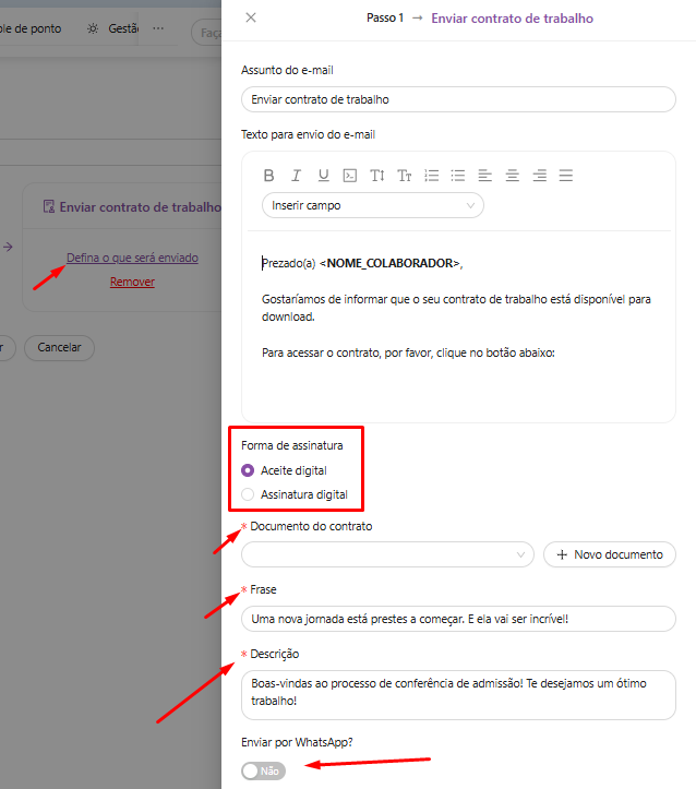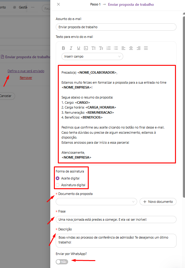 Botão “Defina o que será enviado”: o gestor pode editar o texto que será enviado ao candidato e escolher se o link/mensagem será encaminhado também pelo WhatsApp, além do e-mail.