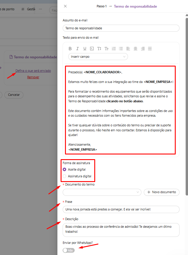 Botão “Defina o que será enviado”: possibilita editar a mensagem e configurar o envio por e-mail e/ou WhatsApp.