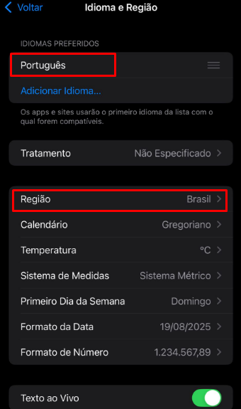 💡 Dica: se o idioma continuar diferente mesmo após a alteração, verifique se o celular possui mais de um idioma configurado na lista. Mantenha o Português (Brasil) como o primeiro da lista de preferências.