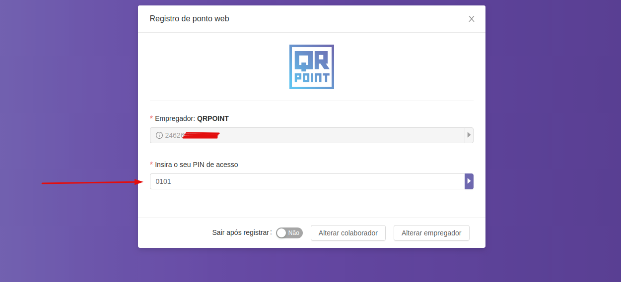 1º PASSO: Colocar o código do empregador e o PIN do colaborador