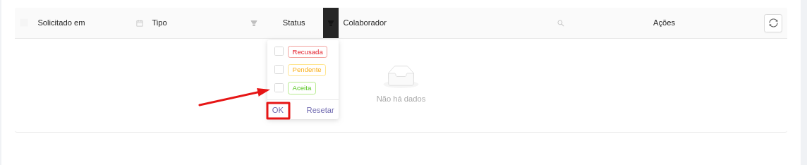Logo em seguida irá aparecer essa tela e você filtra os STATUS para ACEITAS e clica em OK