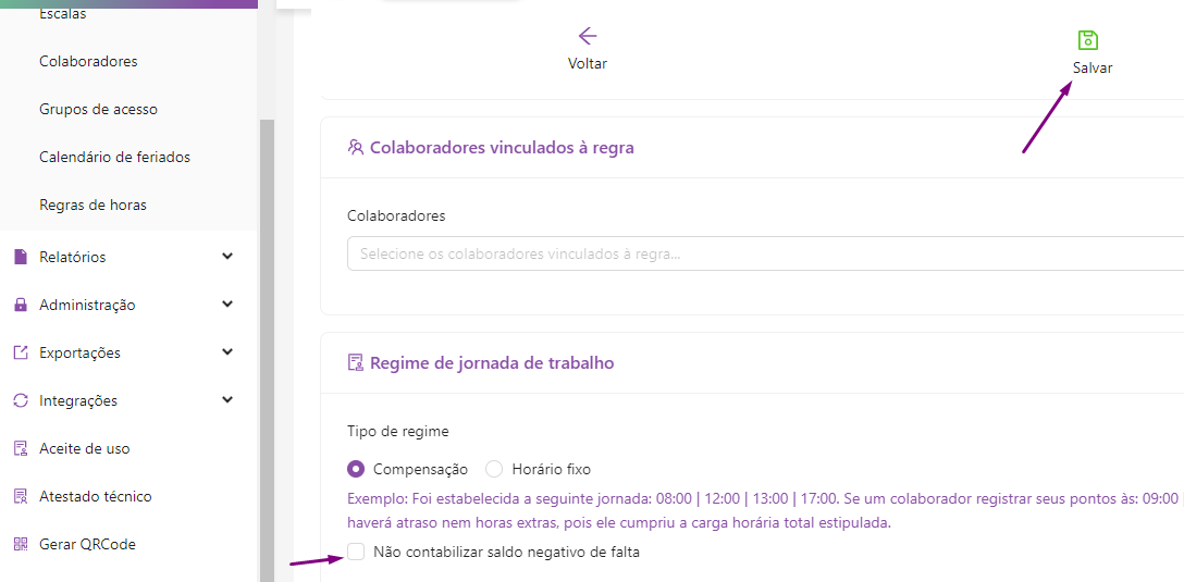 Dica: Essa configuração está logo abaixo da seleção de colaboradores em Regime de Jornada de Trabalho.