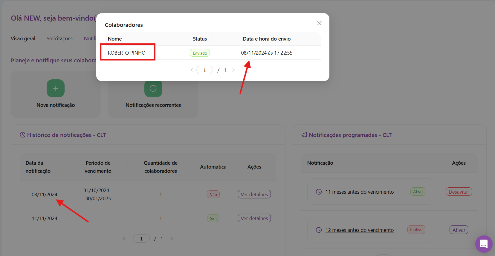 Por exemplo, como mostrado na tela abaixo, uma notificação enviada em 08/11/2024 para o colaborador Roberto Pinho registrou data e hora específicas, permitindo rastrear o envio.