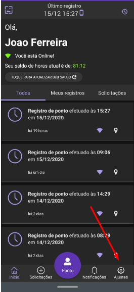 O primeiro passo é abrir o aplicativo, digitar o seu PIN de acesso e na tela inicial você irá clicar em Ajustes.