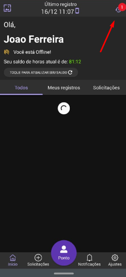 OBS: Antes de atualizar o aplicativo, você terá que sincronizar os registros offline(realizados sem uma conexão com a internet) com o sistema web para que sejam visualizados pelo gestor, que são verificados através de uma notificação vermelha no canto superior direito da tela.