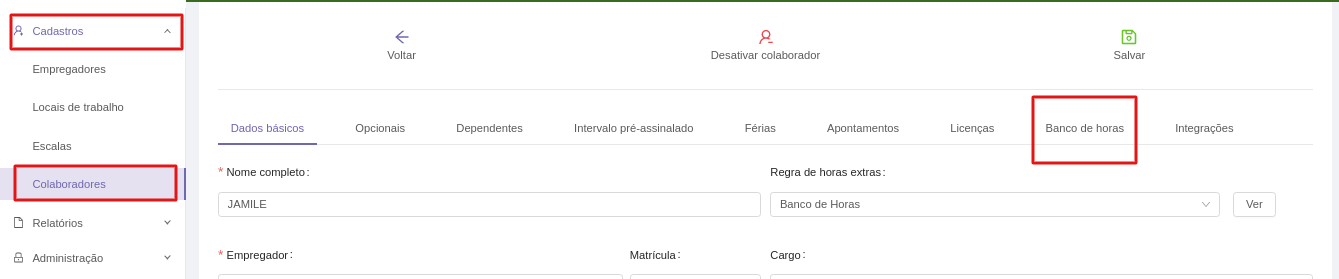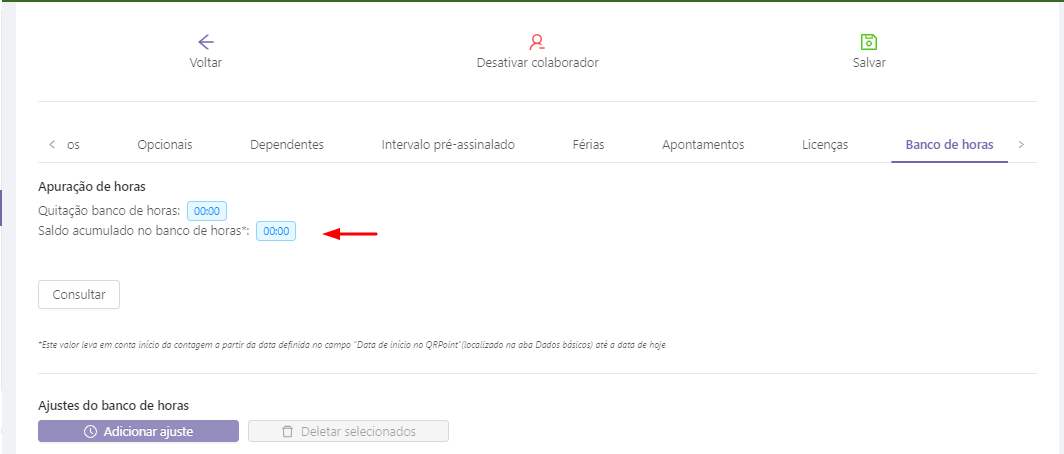 Você deve acessar o menu em CADASTROS > COLABORADORES > ABA BANCO DE HORAS
