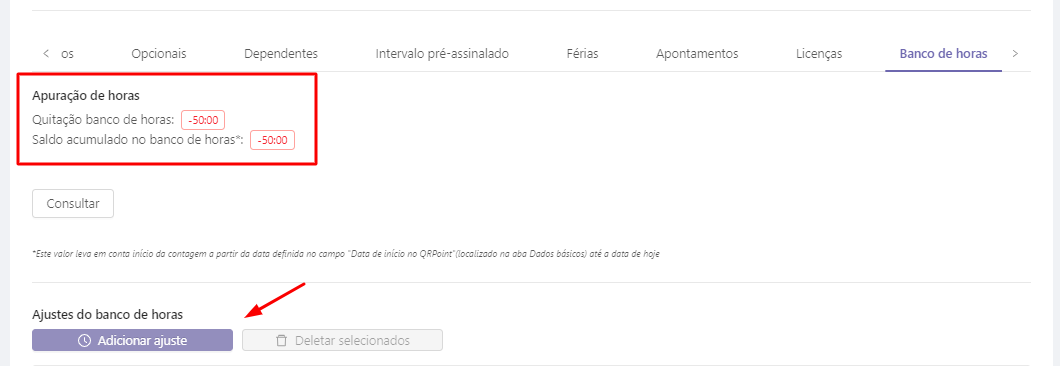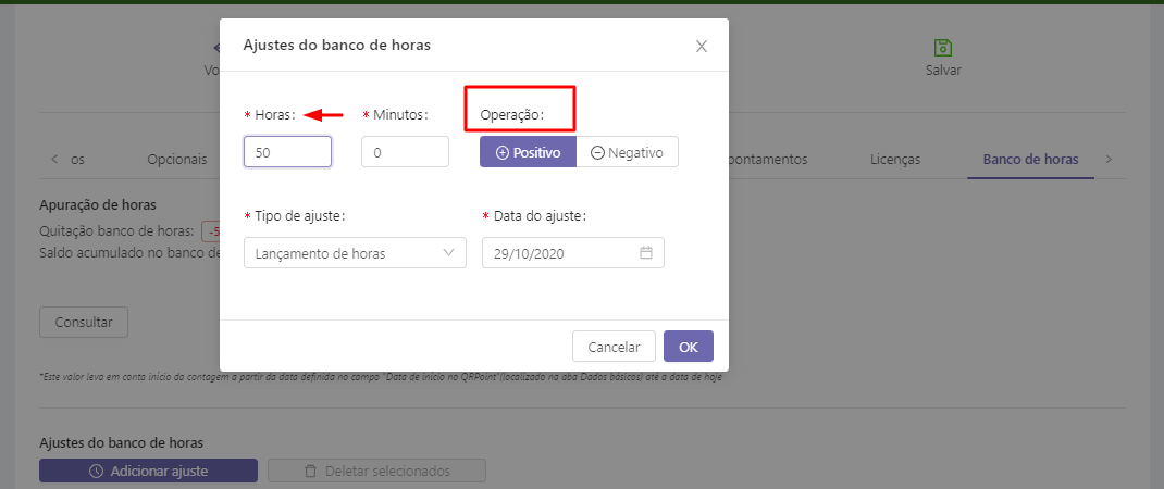 Caso o colaborador esteja com o saldo negativo, o ajuste a ser feito será de transformar essas horas negativas em positivas. E o mesmo vale para o ao contrário.