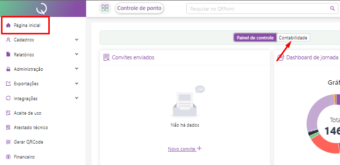Para acessar a tela de configurações da integração com o seu contador, na pagina inicial, você muda a tela de painel de controle para contabilidade