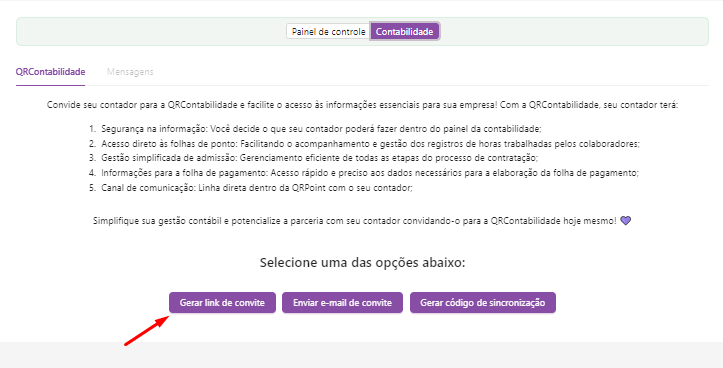 Existem três formas de fazer essa ligação com a contabilidade, na primeira ''Gerar link convite''