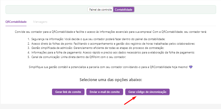 Dessa forma caso o seu contador já tenha uma conta no QRContabilidade, tem a possibilidade de gerar código de sincronização e encaminhar ao escritório, para que os mesmos possam