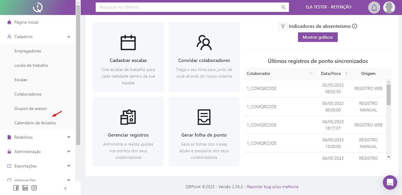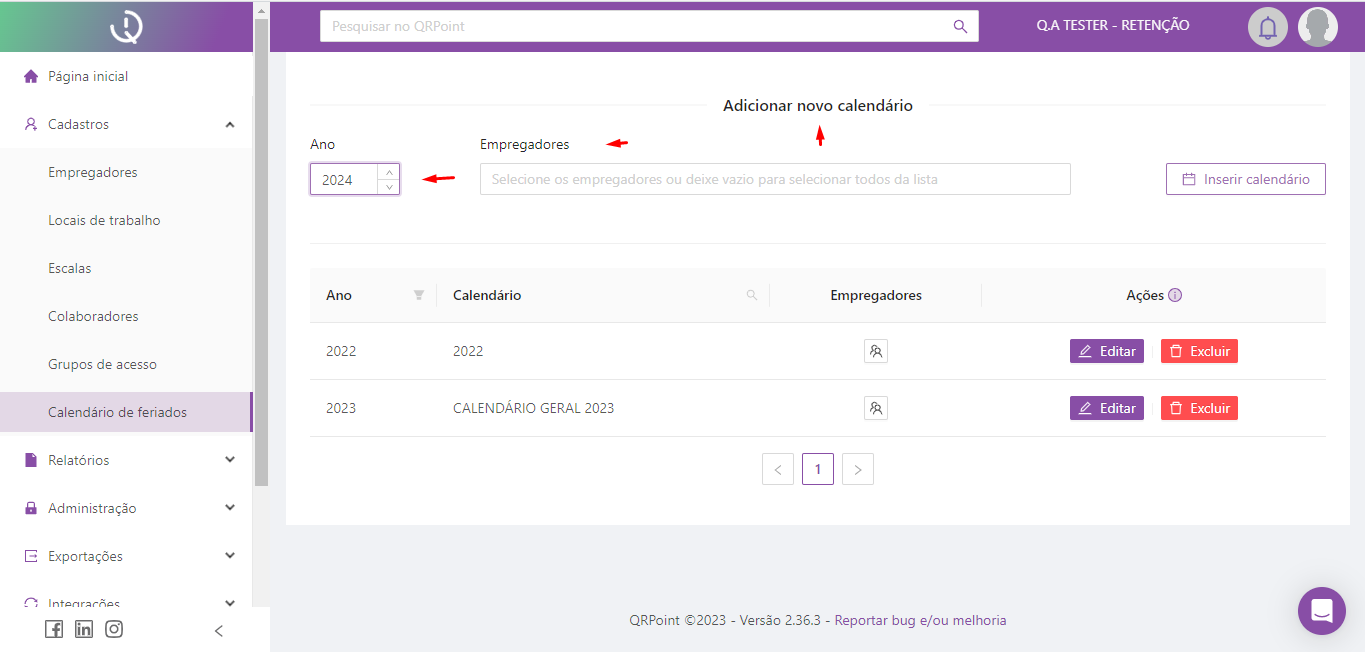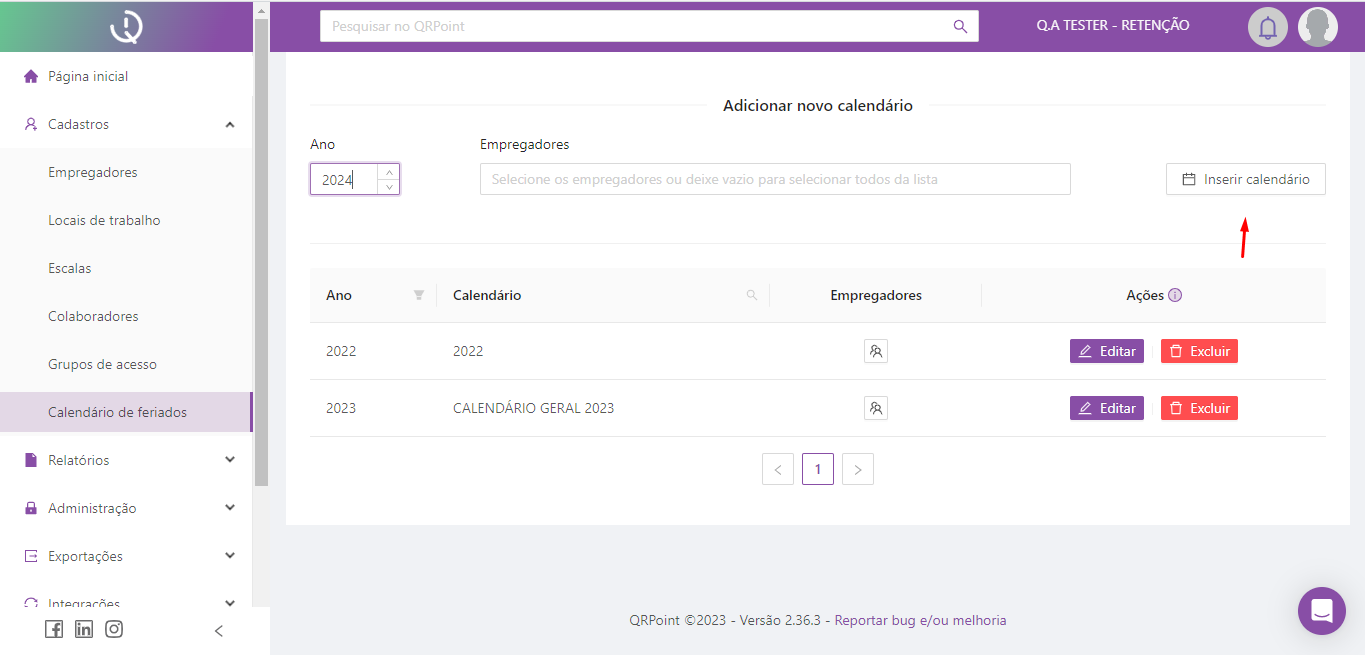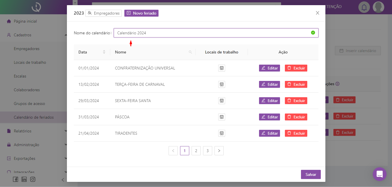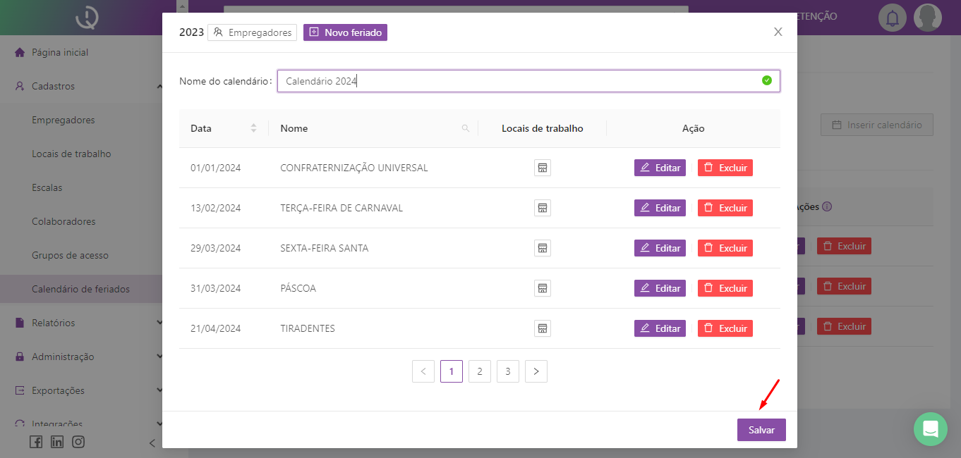 Para criar um novo calendário de feriados basta entrar em MENU > CADASTROS > CALENDÁRIO DE FERIADOS.