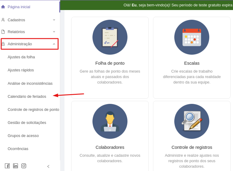 Para criar um novo feriado no calendário basta entrar em MENU > CADASTROS > CALENDÁRIO DE FERIADOS.