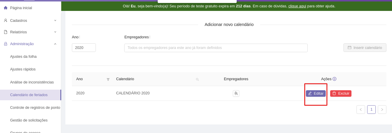Na tela em questão, você deve clicar no botão editar, ao lado do calendário que deseja adicionar o feriado, como mostra na imagem abaixo.