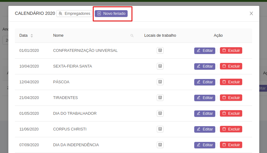 Após isso irá abrir uma janela, na qual você deve selecionar o botão Novo Feriado.